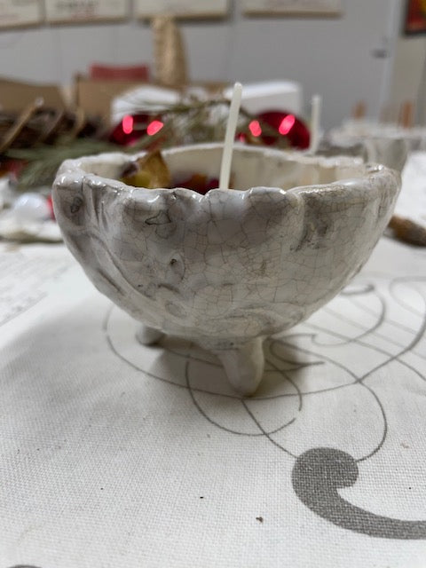 La bougie est entièrement réalisée à la main, du contenant en grès jusqu'à la composition florale. Elle est montrée sur un socle de trois petits pieds.