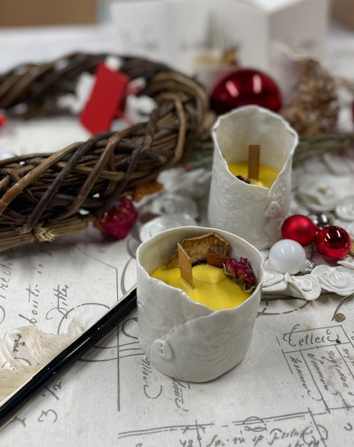 La bougie est entièrement réalisée à la main, du contenant en porcelaine jusqu'à la composition florale.
